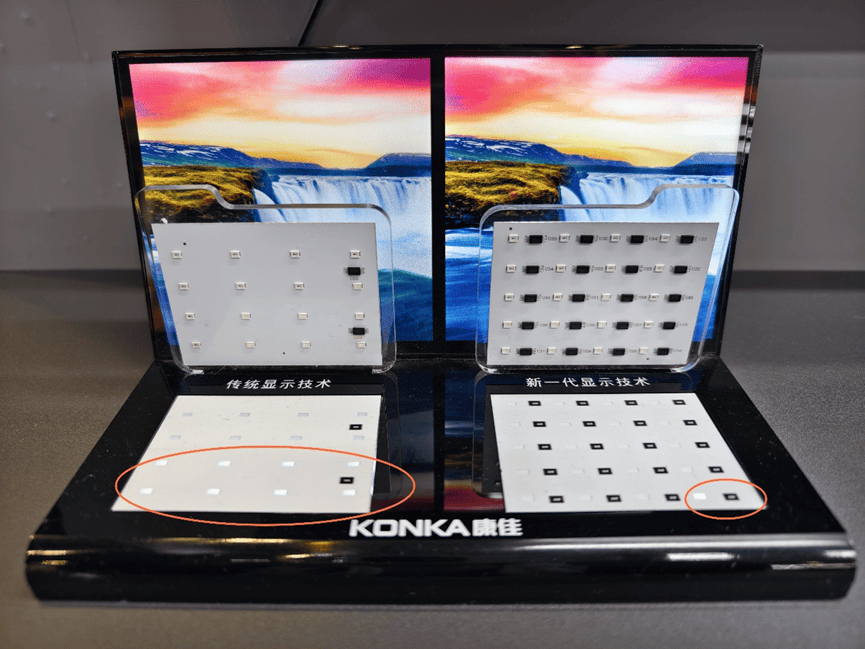 (圖片右側(ce) 展示的是康佳一芯一控,一個(ge) 控光芯片控製一顆燈,突出精準控光)